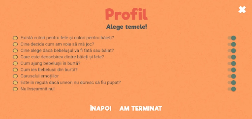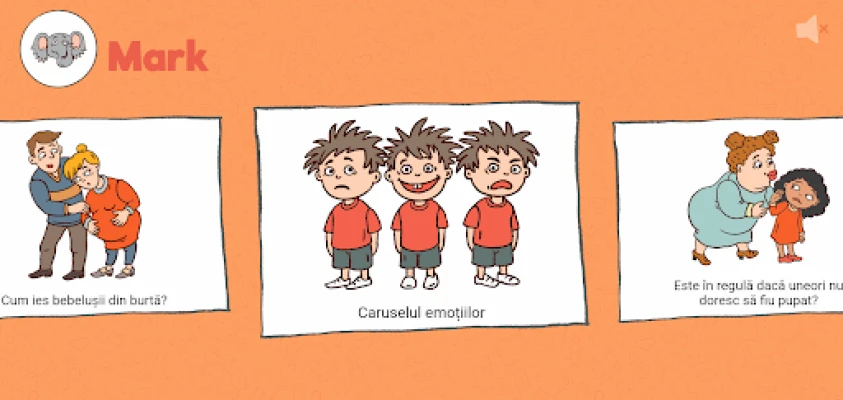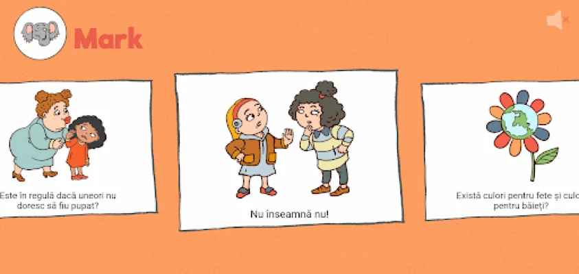 Acest demers cuprinde două instrumente complementare. Pe de o parte, un ghid informativ destinat adulților – părinți, tutori și profesori – care oferă un suport solid și bine documentat pentru a înțelege și a comunica eficient pe aceste subiecte sensibile. Pe de altă parte, am creat o aplicație interactivă special pentru copii. Aceasta preia subiecte cheie din ghid, transformându-le în experiențe de învățare ludice și ușor de digerat. Întrebări precum „Există culori pentru fete și culori pentru băieți?" sau „De unde vin bebelușii?" sunt prezentate într-un format captivant, îmbogățit cu ilustrații vesele, animații dinamice și înregistrări audio. Această abordare multisenzorială permite copiilor să exploreze și să descopere singuri răspunsurile, sau să o facă alături de un adult, transformând fiecare sesiune într-o aventură educativă memorabilă.