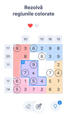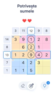 Încearcă Number Sums, provocarea matematică de la Easybrain, care îți va pune la încercare agilitatea mentală și logica! Acesta nu este doar un simplu joc cu numere, ci o misiune complexă unde fiecare rând, coloană și zonă colorată de pe tablă trebuie să atingă simultan suma indicată. Obiectivul tău este să selectezi cu precizie numerele esențiale și să le elimini pe cele care nu se potrivesc, asigurându-te că toate ecuațiile se validează perfect. Fiecare puzzle din Number Sums este un univers în sine, având o singură cale de rezolvare, așteptând să fie descoperită de tine.