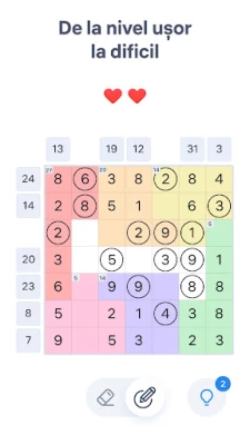 Mecanica de joc în Number Sums este intuitivă și rafinată. Vei naviga cu ușurință între modul de selectare, pentru a marca numerele corecte, și modul de ștergere, pentru a elimina valorile inutile, toate acestea pentru a dezlega fiecare enigmă. Designul minimalist și curat al Number Sums, creat de Easybrain, asigură o experiență de joc plăcută și neîntreruptă. Nu există limite de timp, permițându-ți să te concentrezi deplin pe găsirea soluției unice, iar dacă te vei bloca, vei avea la dispoziție indicii utile care să te ghideze. Provocă-ți logica oriunde și oricând cu Number Sums!