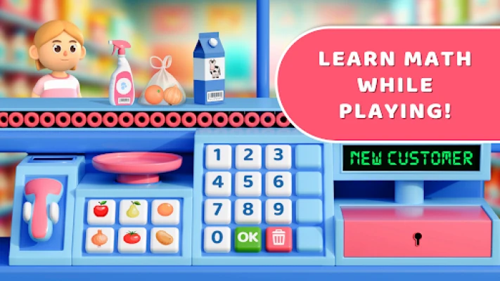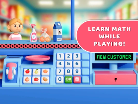 Supermarket Maths: Learn & Fun transformă copiii în casieri. În acest simulator educativ și interactiv, ei exersează adunarea și scăderea, învață gestionarea banilor și își dezvoltă abilitățile de calcul. O metodă distractivă de a învăța matematica la casa de marcat!